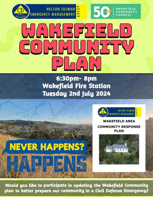 Next Tuesday we welcome anyone in the Wakefield Community to attend a meeting to participate in updating the Wakefield Community plan to better prepare our community for a Civil Defence Emergency.