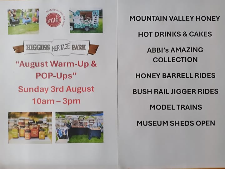 With the sun forecast to be back in our district on Sunday, come and enjoy a picnic in the pavilion AND our August Warm-up & POP Ups of Mountain Valley Honey, Wake Me Up Coffee Hot drinks & cakes, Abbi’s Amazing Collection, honey barrel and jigger rides, model trains and Museum sheds open.