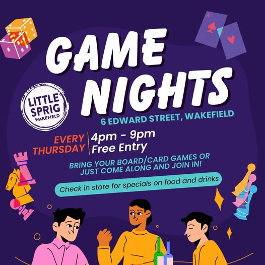 Thursday nights ( Starting from August 28th ) at Little Sprig in Wakefield. This one starts and ends later, 4pm – 9pm. There will be a couple of reserved tables for us to play board games and card games. There should be some food and drink specials too.