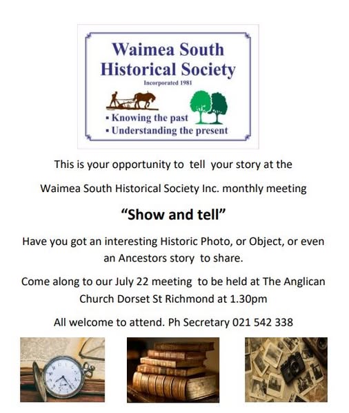 Amid all the flood relief happening in our Waimea South rural areas especially, our thoughts are with you all as you navigate through this disaster. Our next meeting advertised below may give you a chance to share a past event. Anyone is welcome to attend.